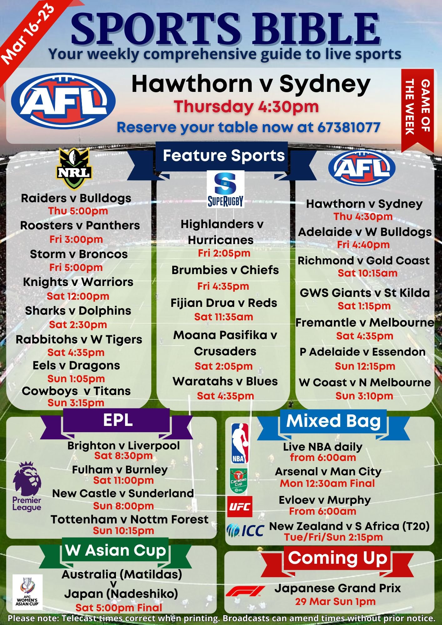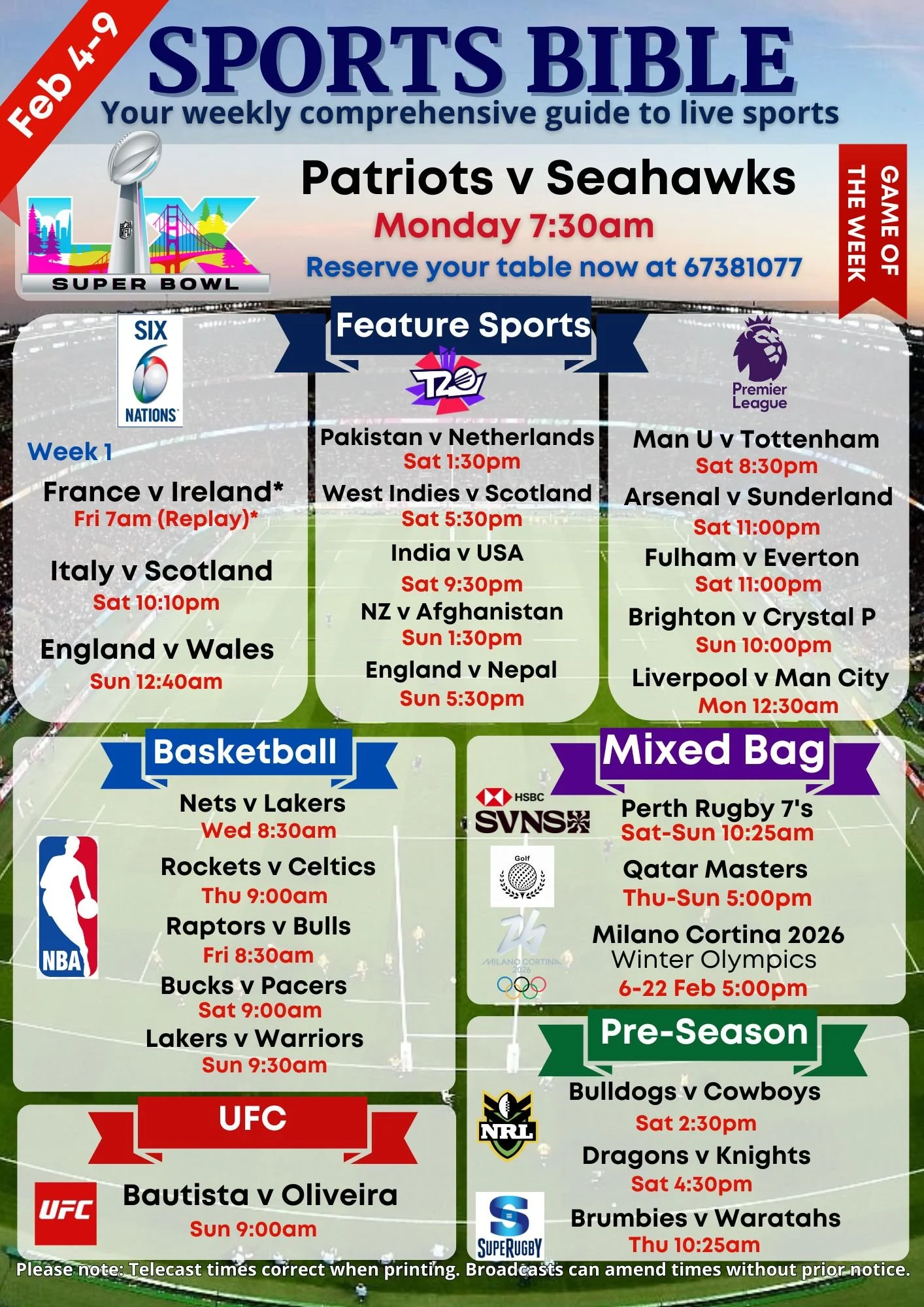 9 TV’S ACROSS THE VENUE FOR PLENTY OF OPTIONS. IF YOU DON’T SEE SOMETHING YOU WANT TO WATCH, REACH OUT ON FACEBOOK OR INSTAGRAM